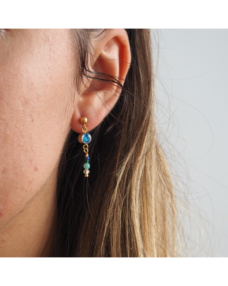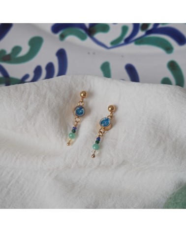 Pendiente creado con base de circulito de resina con granada dibujada artesanalmente y abalorio elaborado con cristales a conjunto con las tonalidades. Diseño elaborado y creado artesanalmente en España.