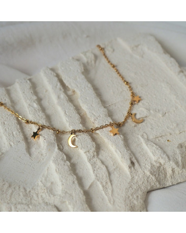 Choker cadena de bolitas con dijes de estrellas y lunas, creada y montada artesanalmente en España. Material acero inoxidable chapado en oro de 18k
