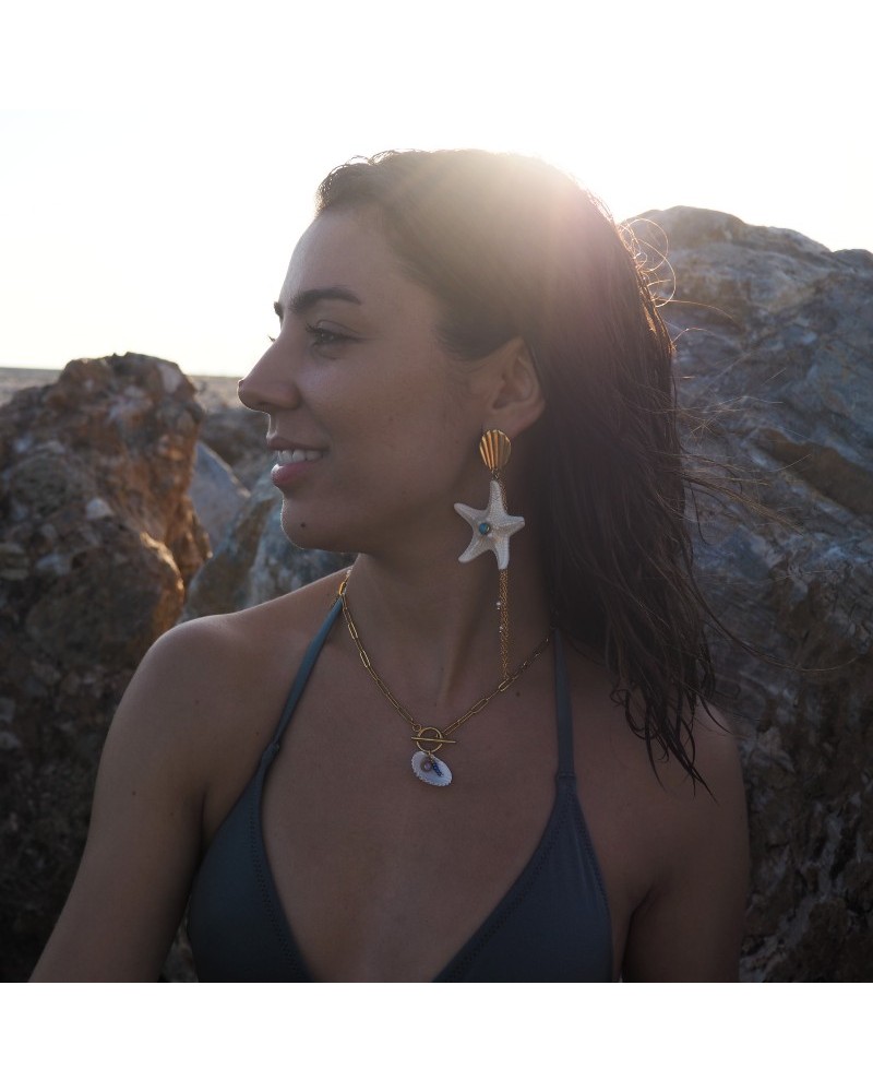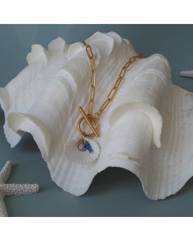 Colgante creado con cadena de eslabón grueso, cierre T y mosquetón decorado con concha natural, cristales de colores y circulito de resina.