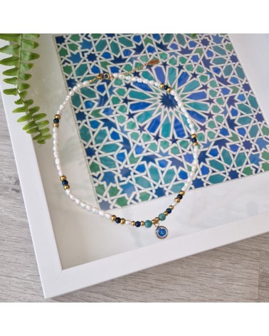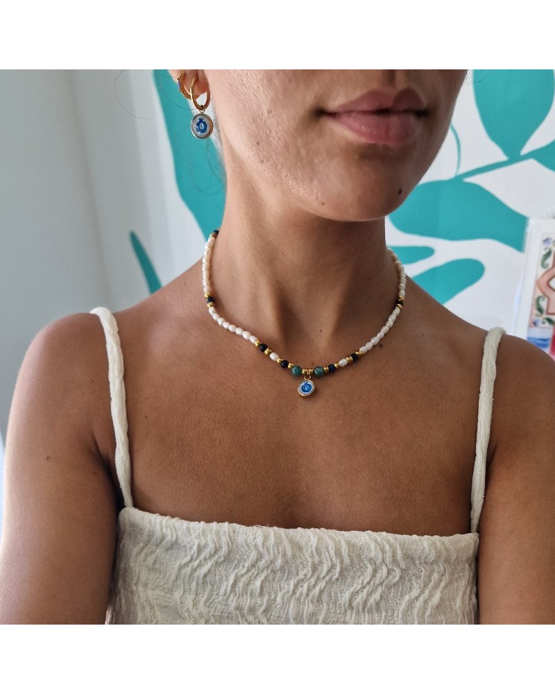 Colgante creado con perlas naturales, bolas de acero dorado y piedras de ojo de tigre y apetito azul naturales, combinadas con un circulito de resina con granada pintada a mano. Diseño elaborado y creado artesanalmente.