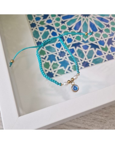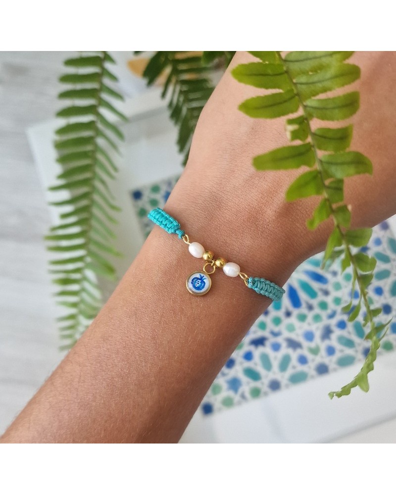 Pulsera de macramé turquesa con perlas naturales, bolas de acero doradas y un circulito de resina con granada pintada a mano. Diseño elaborado y creado artesanalmente.