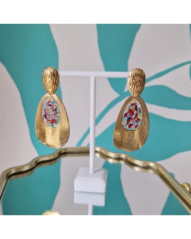 Pendientes con base ovalada, elaborados artesanalmente con resina y flores preservadas naturales.