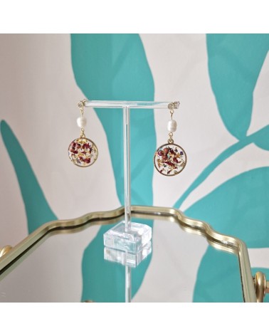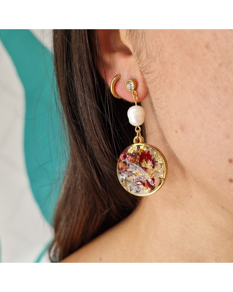 Pendientes con base en forma circular y perla natural de río, elaborados artesanalmente con resina y flores preservadas naturales.