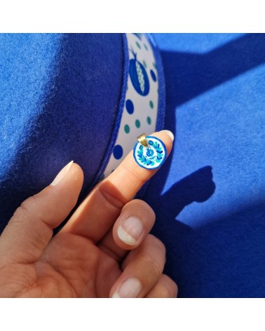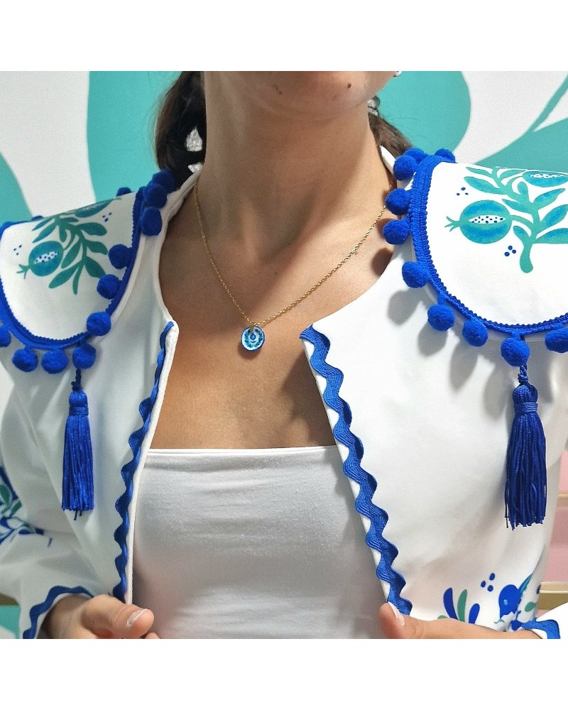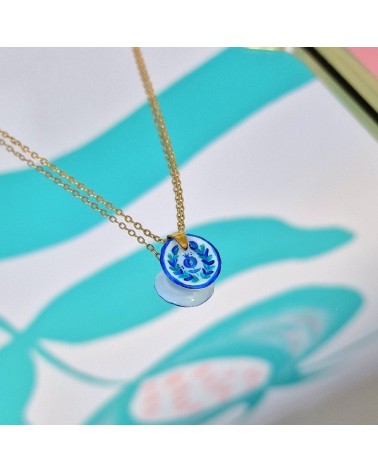 Colgante con cadena fina y plato de cerámica creado artesanalmente con dibujo inspirado en la cerámica granadina.