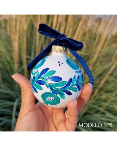 Pack de tres bolas navideñas de cristal efecto porcelana, pintadas artesanalmente con acrílico y algunas contienen pan de oro. Llevan hilo para poder colgar y un lazo de terciopelo azul noche.
