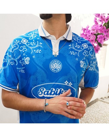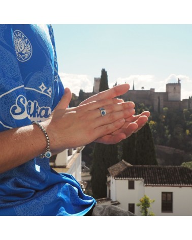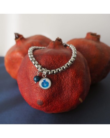 Pulsera de eslabón de serpiente con base redonda de resina blanca y dibujo creado artesanalmente en referencia a nuestra cerámica granadina, puedes elegir colocarle una piedra natural de ojo de tigre azul.