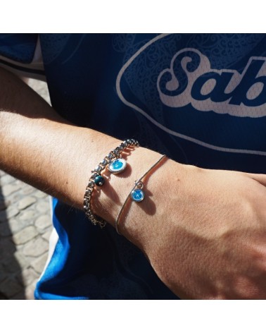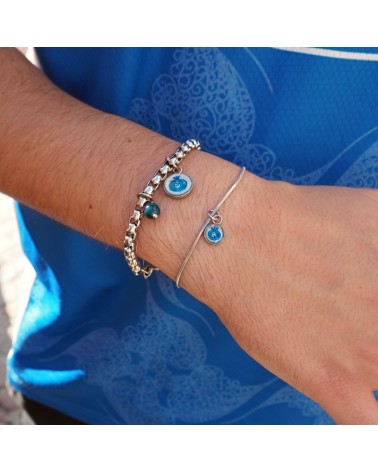 Pulsera de cadena de serpiente fina con base redonda de resina blanca y dibujo creado artesanalmente en referencia a nuestra cerámica granadina.