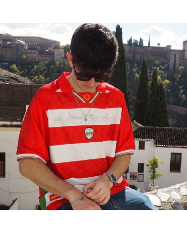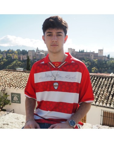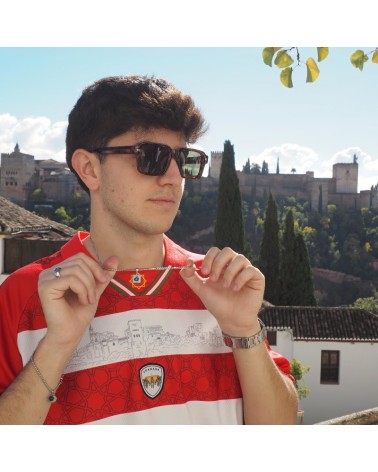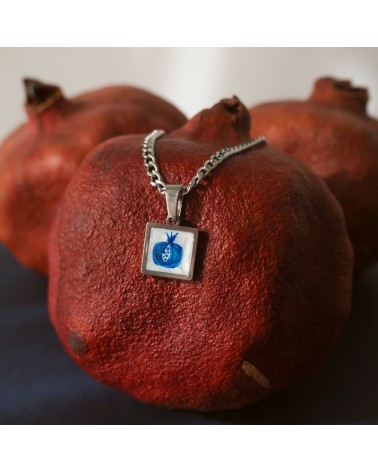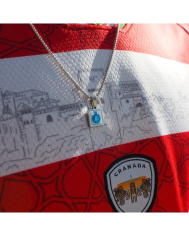 Colgante con dos opciones de cadena, cadena de serpiente fina o de eslabón plano con base cuadrada de resina blanca y dibujo creado artesanalmente en referencia a nuestra cerámica granadina.