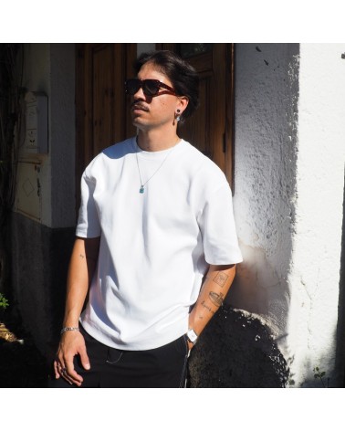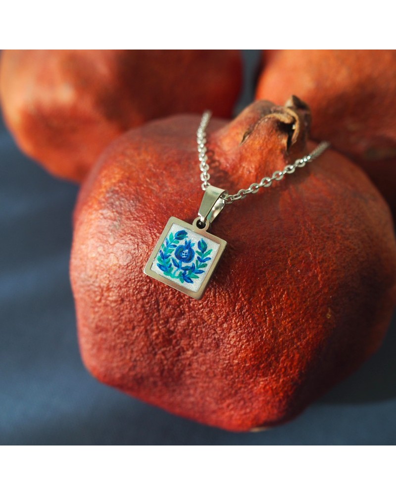 Colgante con cadena fina, base cuadrada de resina blanca y dibujo creado artesanalmente en referencia a nuestra cerámica granadina.