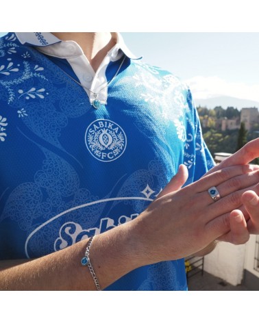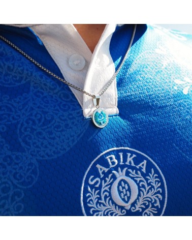 Colgante con cadena de serpiente redonda fina, base rectangular de resina blanca y dibujo creado artesanalmente en referencia a nuestra cerámica granadina.