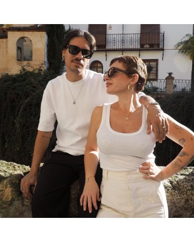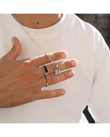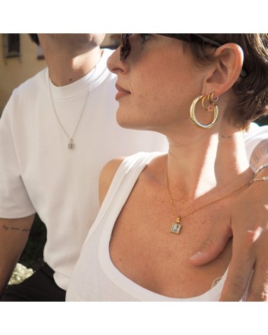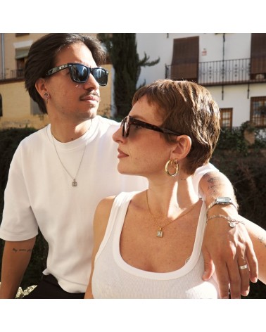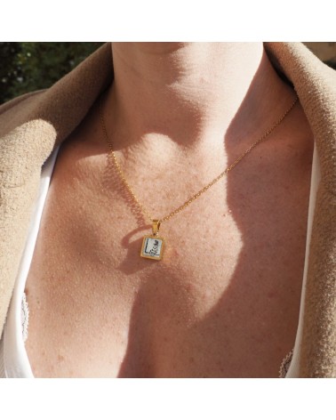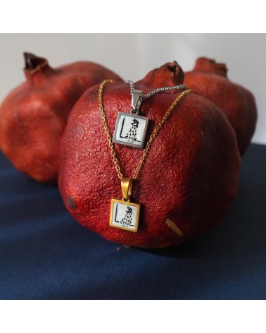 Colgante con cadena fina, base rectangular de resina blanca y dibujo creado con uno de los dibujos que representan al poema romance de la luna de Federico García Lorca.