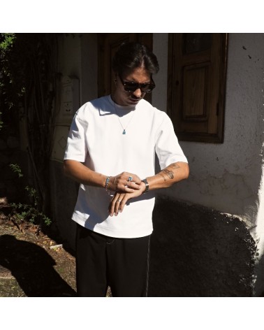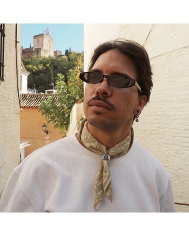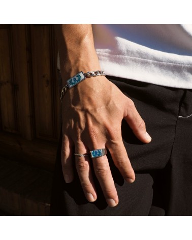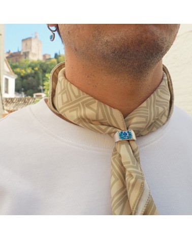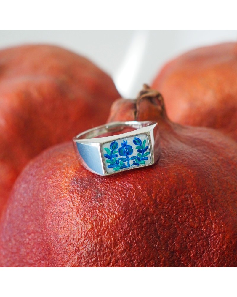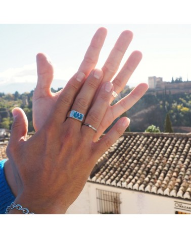 Anillo ajustable con diseño rectangular y base de resina blanca con dibujo pintado artesanalmente inspirado en nuestra cerámica granadina.