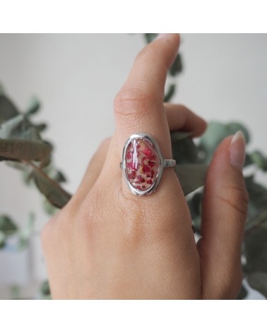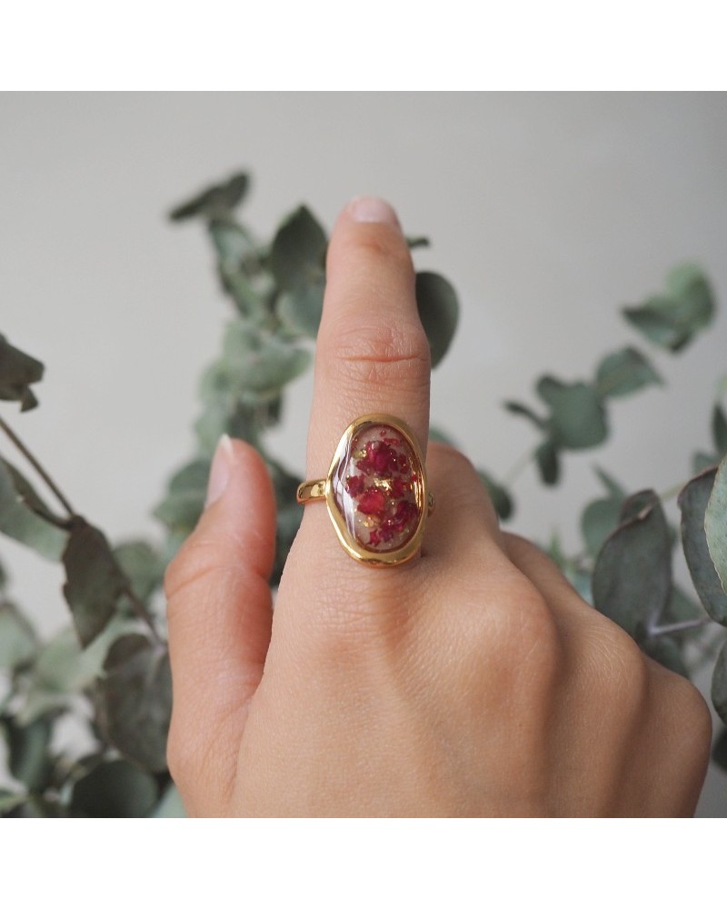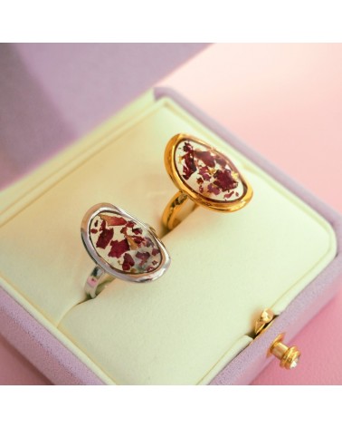 Anillo ajustable creado con resina y flores preservadas de rosas naturales y pan de oro.