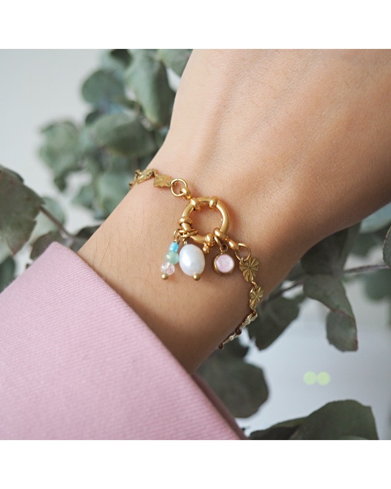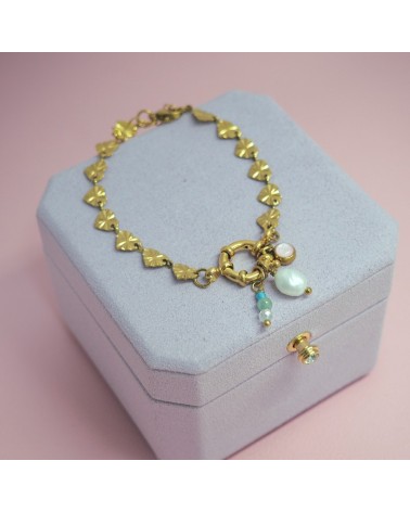 Pulsera creada artesanalmente con cadena de corazones y mosquetón con abalorios de cristales, perla natural de río y circulito de resina.