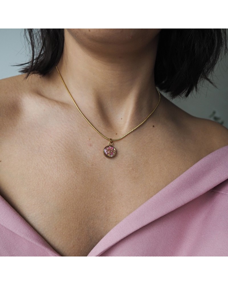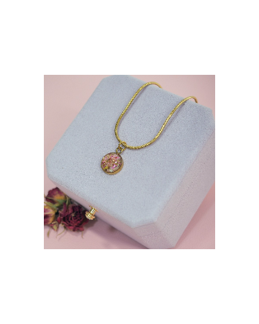 Colgante creado artesanalmente con abalorio de resina con flores preservadas y pan de oro.