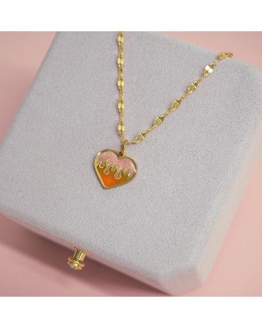Colgante creado artesanalmente con relleno de resina en tono rosa y naranja.