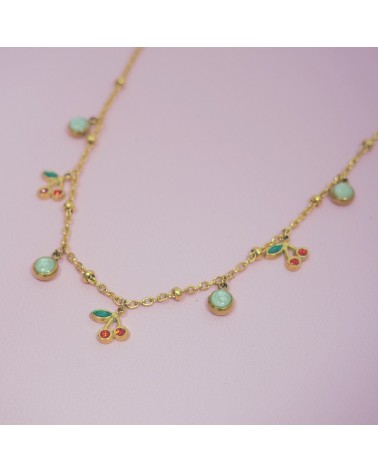 Gargantilla creada con abalorios de cerezas y circulitos rellenos de resina con pigmento verde claro.