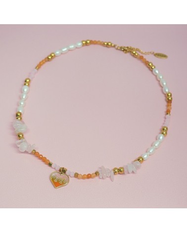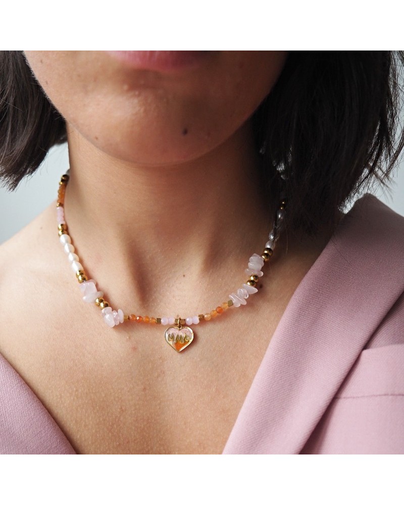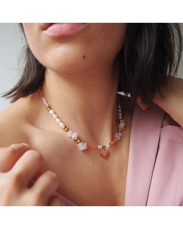 Choker creado con perlas naturales de río, cuarzo rosa natural, piedra jade naranja y abalorio de corazón en llamas relleno de resina con pigmento naranja y rosa.
