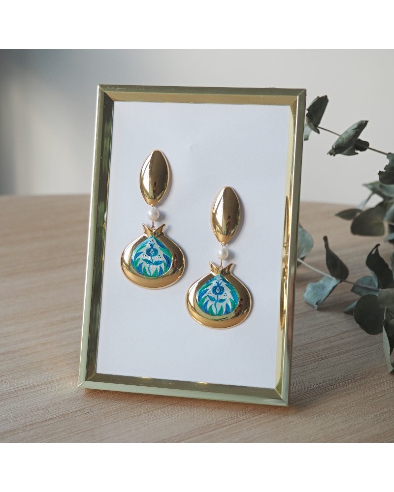 Pendientes creados artesanalmente con base de granada de resina blanca y dibujo pintado con acrílico, acompañados de unas perlas naturales de rio.