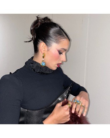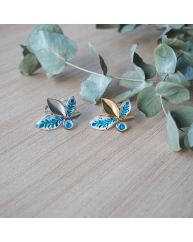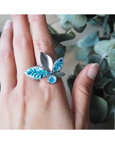 Anillo ajustable con pétalos de flores rellenas artesanalmente de resina blanca con dibujos creados en acrílico.