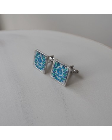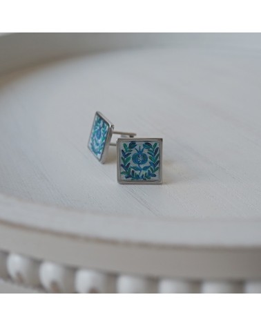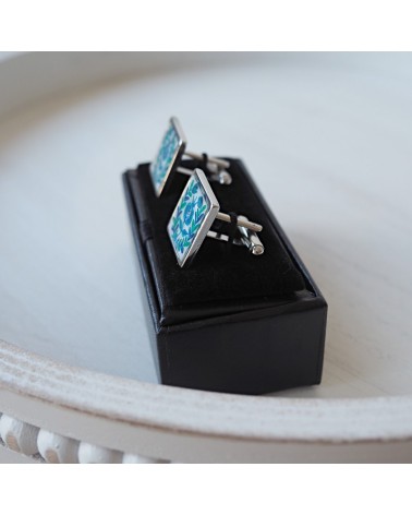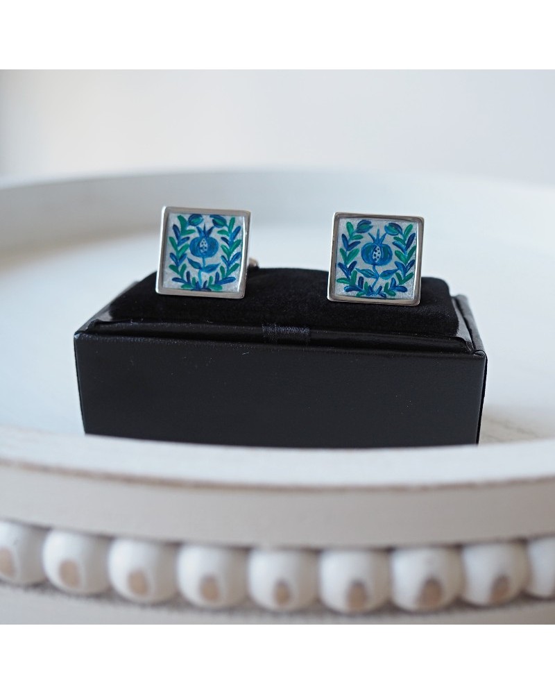 Gemelos creados artesanalmente con base cuadrada rellena de resina y dibujo en acrílico del típico plato de cerámica granadina.