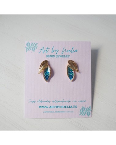 Pendientes de hojas con una de ellas rellena de resina artesanalmente con un dibujo de una granada con hojas.