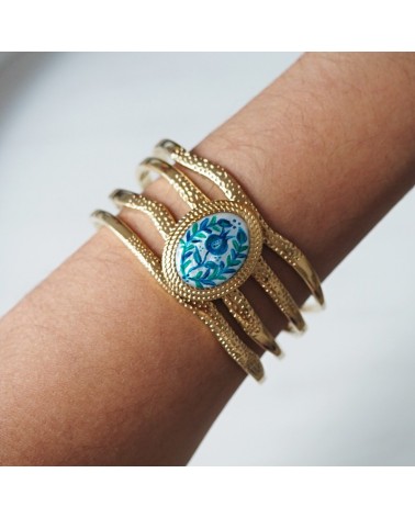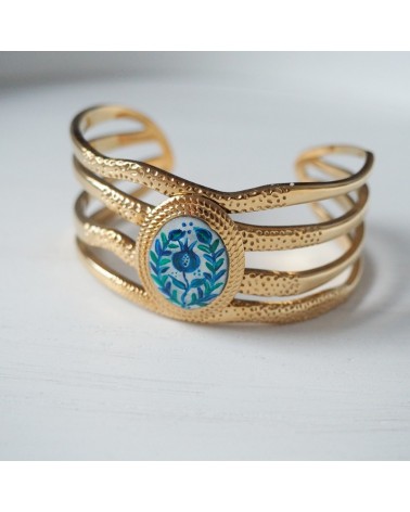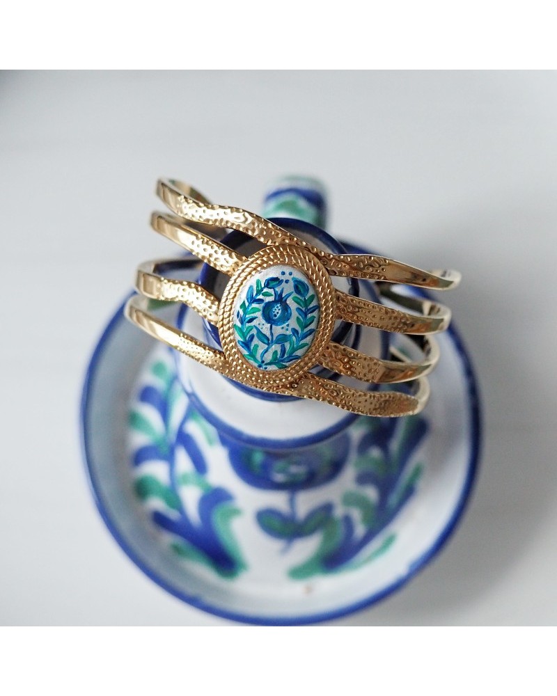 Brazalete rígido con pieza central creada artesanalmente con resina y dibujada a mano con una granada y sus ramas.
