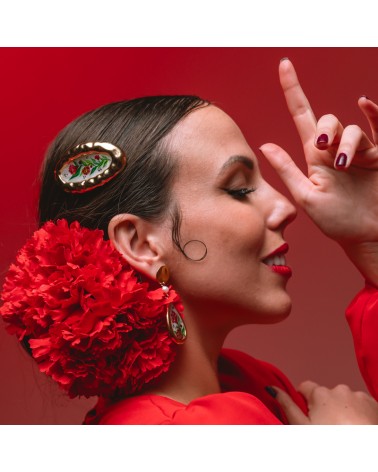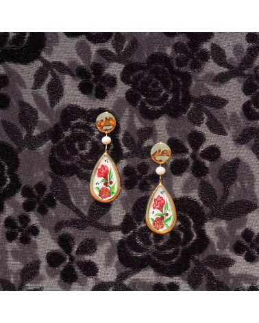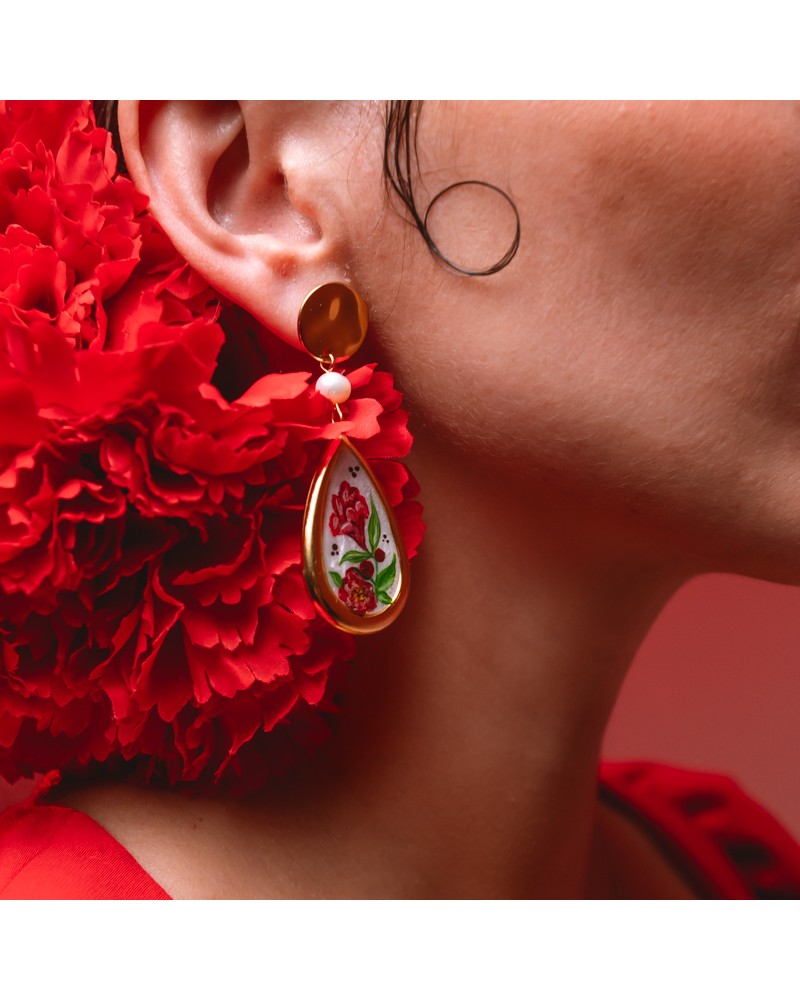 Pendientes creados artesanalmente con perlas naturales de río y piezas rellenas de resina con pigmento blanco y dibujo pintado a mano con la flor de la punica del fruto de la granada.