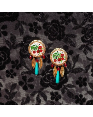 Pendientes creados artesanalmente con piezas rellenas de resina y dibujo de ramas con granadas y flores de punica pintados a mano con acrílico, acompañados de hojas de acero inoxidable labradas y cuentas naturales de ojo de tigre rojo.