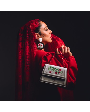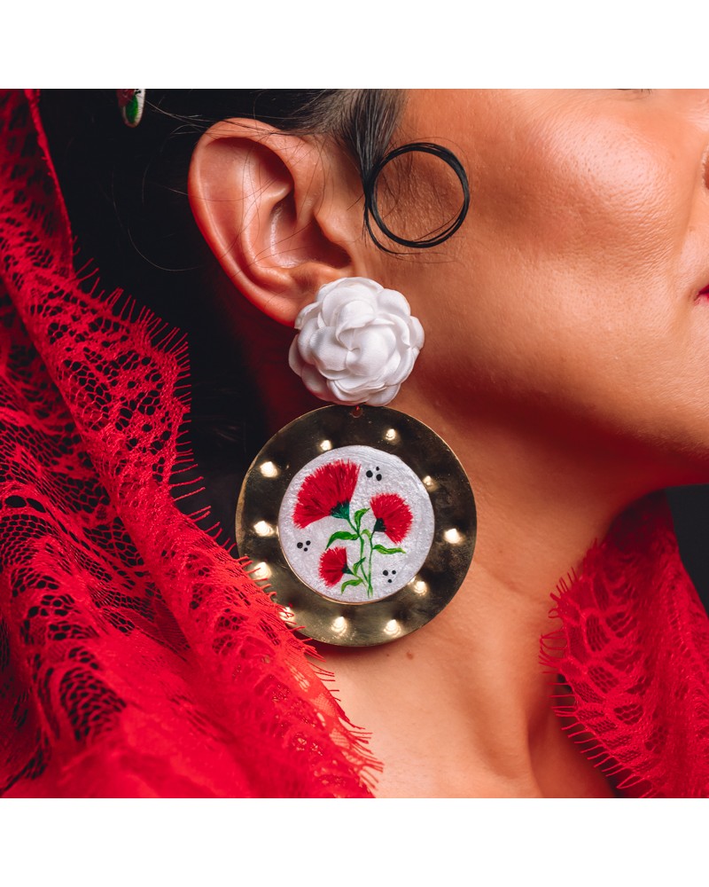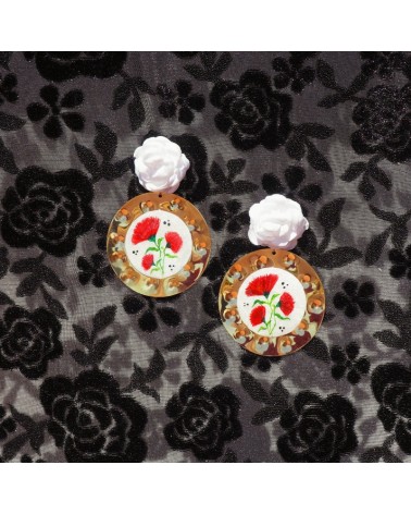Pendientes creados artesanalmente con circulo central relleno de resina pintado a mano con dibujos de claveles, enganches de flores de tela.
