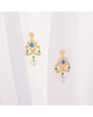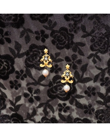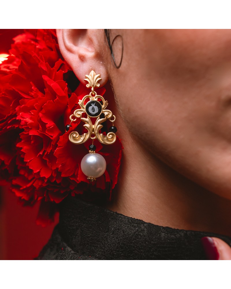 Pendientes creados artesanalmente con circulo central relleno de resina pintado a mano con una granada acompañado de cristales pequeños y perla.