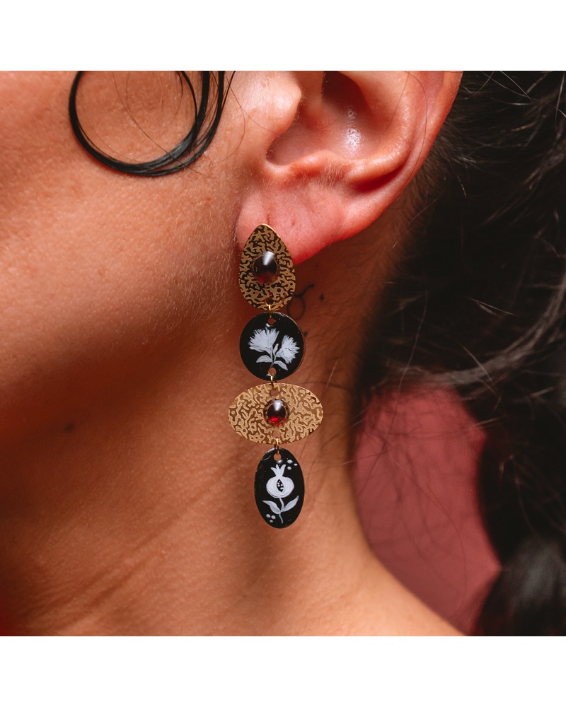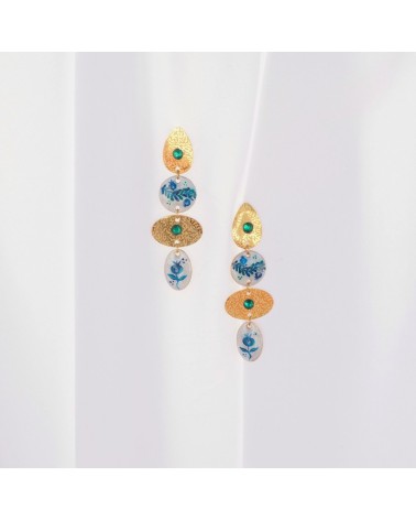 Pendientes creados artesanalmente con piezas grabadas a laser y circonita central acompañado de piezas rellenos de resina pintadas a mano con diferentes dibujos.