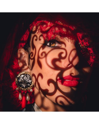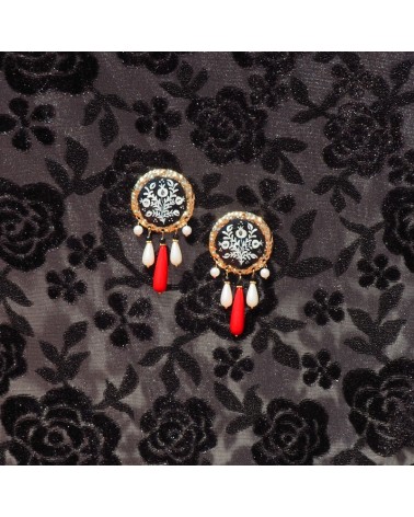Pendientes creados artesanalmente con pieza central rellena de resina y pintada a mano acompañada de perlas, cristales y lagrima roja.