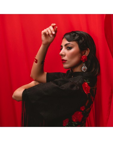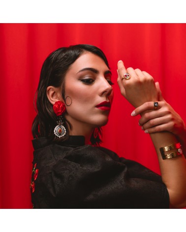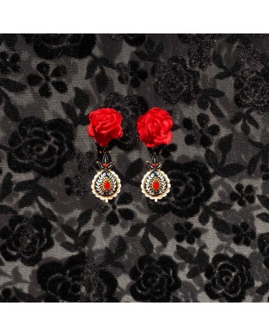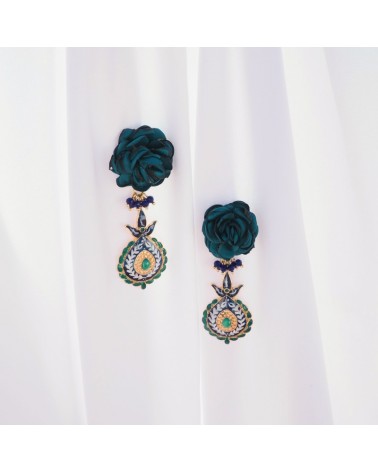 Pendientes creados artesanalmente con pieza central rellena de resina y pintada a mano acompañada de cristales y enganche de flor de tela.