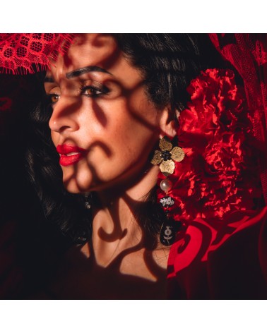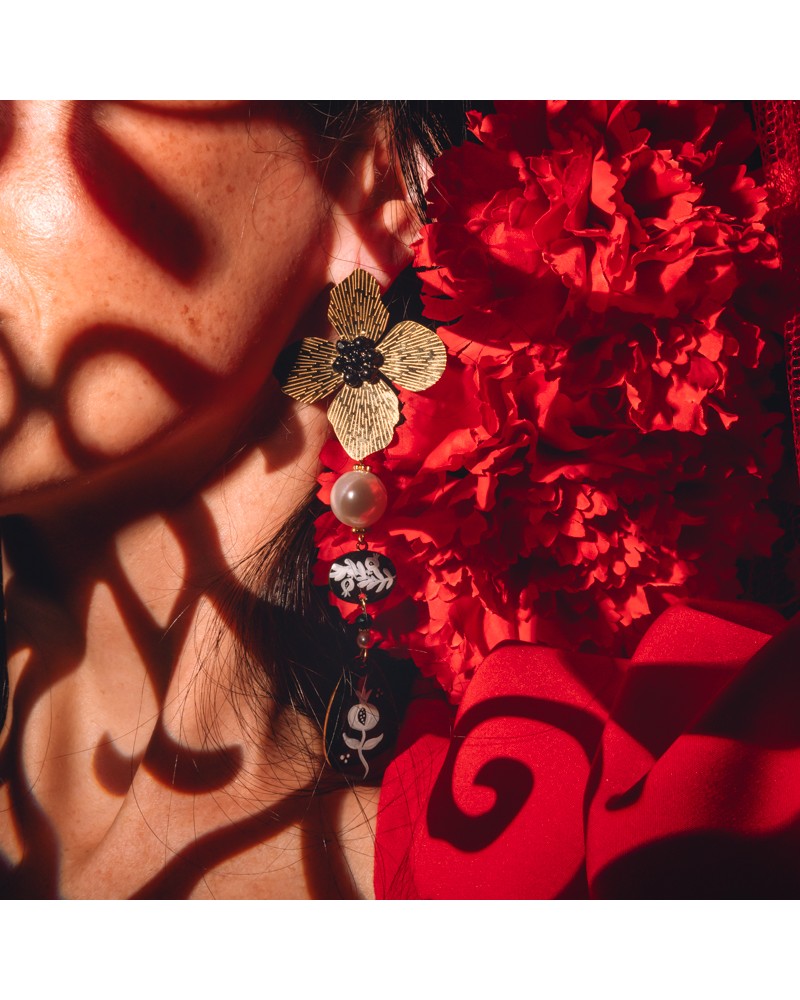 Pendientes creados artesanalmente con pieza central de la flor con cristales y piezas rellenas de resina y pintadas a mano acompañadas de perla dependiendo del color que elijas.