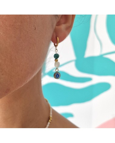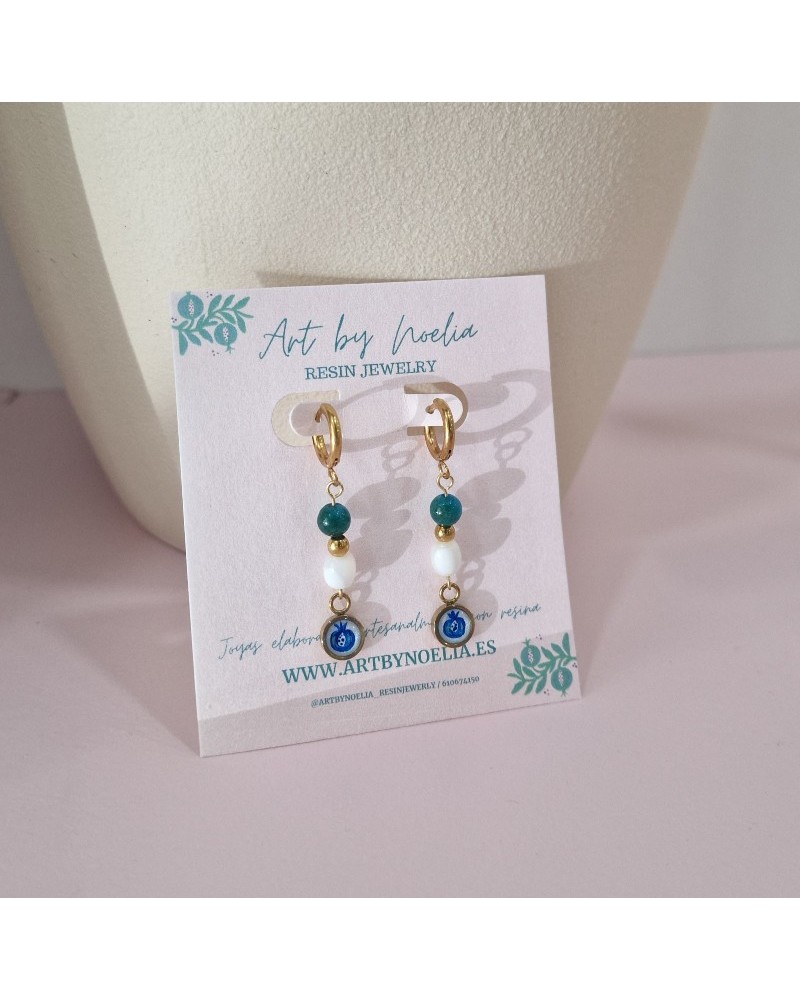 Pendientes creados con piedra natural de apetito azul, pieza nacarada y circulito de resina creado con un dibujo de una granada. Diseñado y creado artesanalmente.